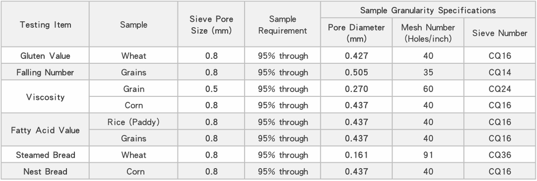 Crushed samples (processed through various sieve plates) are ideal for analyzing gluten quantity/quality, falling number, near-infraredcomponents, grain viscosity, and other precision requirements.